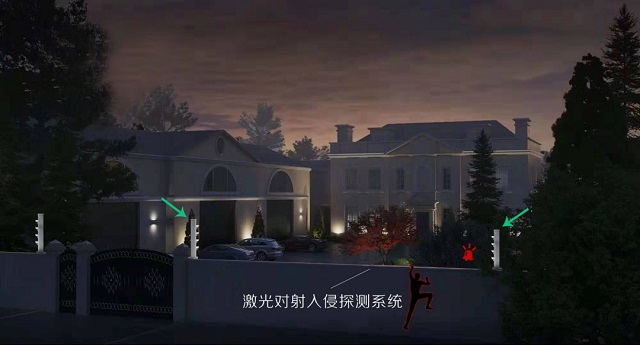 激光對射入侵報警系統在警戒區域內,安裝激光發射機、接收機,形成一個隱形的激光圍欄。激光發射機向接收機發射出多道不可見激光,接收機在接收到激光信號,形成完成的光通道。當有入侵者入侵時,阻擋通道內的激光光束,接收機做出響應。